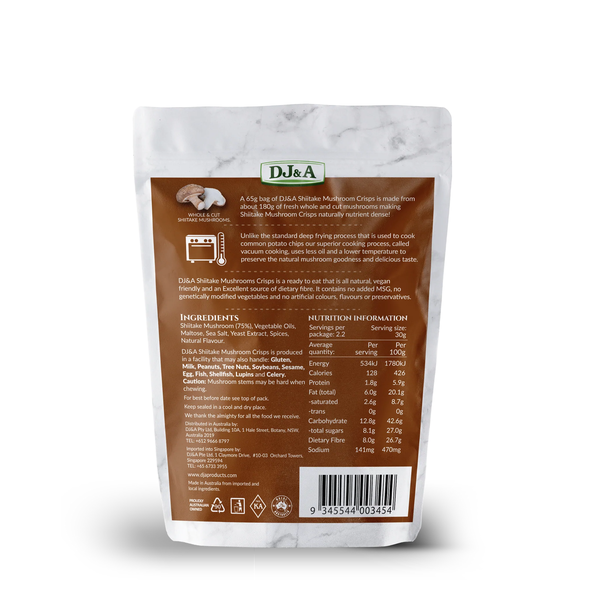 Nấm hương sấy giòn DJ&A được nhập khẩu từ Úc. Nấm này được trồng trên cây gỗ và được sấy lạnh giòn tan được sử dụng để làm thực phẩm bảo quản lâu giữ được chất dinh dưỡng. Nấm hương sấy giòn có mùi hương thơm nồng và vị chua ngọt, được sử dụng rất phổ biến trong ẩm thực Việt Nam và cũng được sử dụng trong các món ăn trong và ngoài nước. Nấm hương còn có tác dụng cho sức khỏe, như tăng cường hệ miễn dịch, giảm cholesterol và hỗ trợ tiêu hóa.
